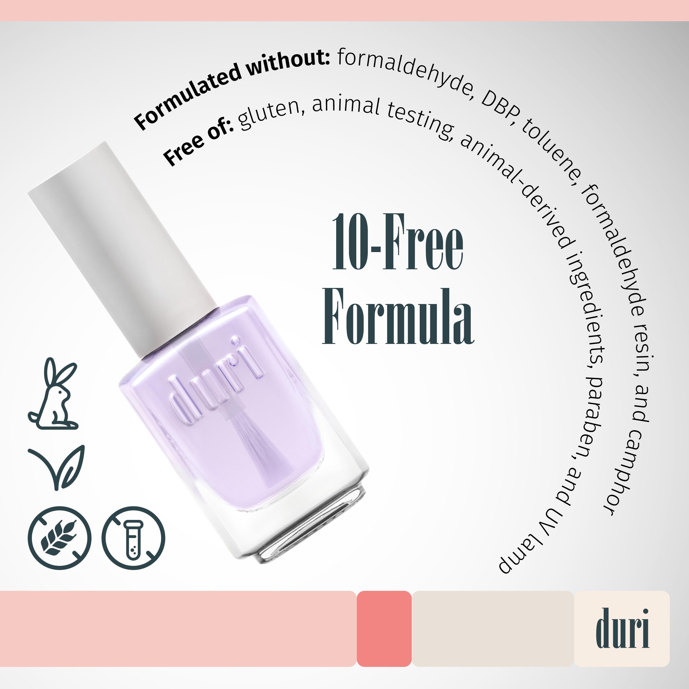 10-free formula - Our quick dry top coat is formulated without formaldehyde, DBP, toluene, formaldehyde resin, and camphor. It’s also gluten-free, no animal testing, no animal-derived ingredients, paraben-free, and UV lamp-free.